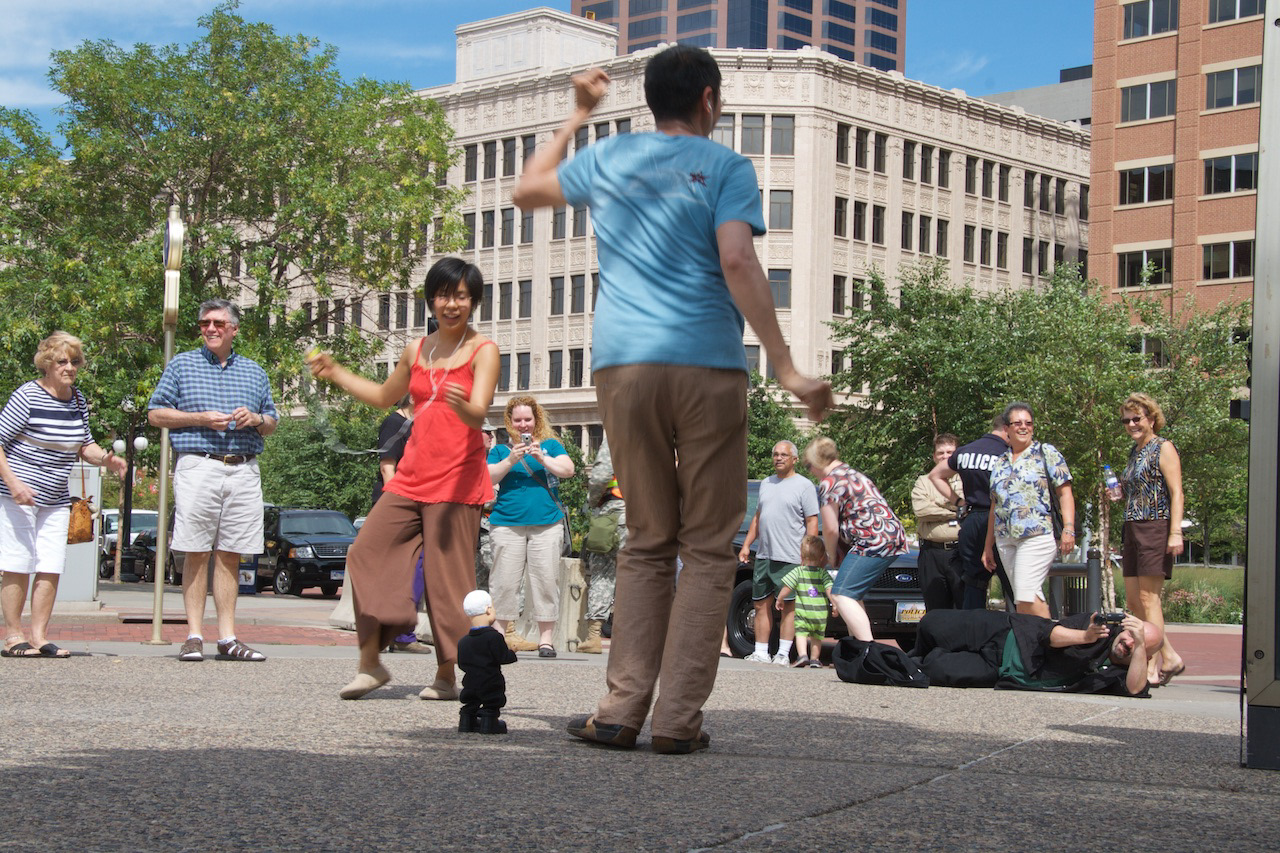 Don't You Feel It Too is "a participatory radical street dance practice for social healing and inner-life liberation" created by Marcus Young. These images are from one of the first of the DYFITT events, in 2008 during the 2008 Republican National Convention, where participants spread across the St. Paul city center donned their headphones with their favorite playlist, and over the course of a few hours danced their way to meet together in the center. Find out more about this still ongoing practice here